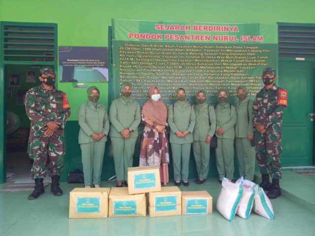 Onlinekoe.com – Ibu-ibu pengurus dari persatuan isteri tentara (Persit) kartika candra kirana (KCK) cabang XXXIII/Dim 0421/LS , melakukan kegiatan bakti sosial pada sebuah panti asuhan nurul islam yang terletak di dusun pangkul desa sukaraja kecamatan rajabasa kabupaten lamsel , dengan mengusung tema “Jum’at berbagi” , pada jum’at (09/04/2021).