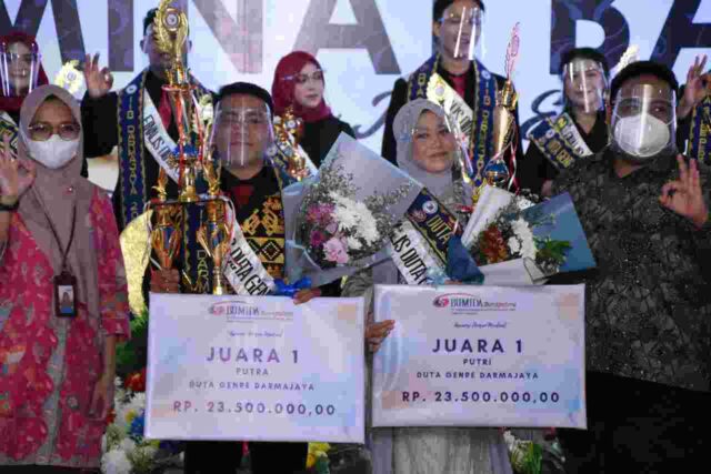 Onlinekoe.com, BANDAR LAMPUNG – Muhammad Aldo Ramadhan dan Widya Antika dinobatkan sebagai Jawara Putera Puteri Kampus Darmajaya, sedangkan Muhammad Rizky Ikhwan dan Sinta Nabila juara pertama Duta Genre, pada Pesta Minat Bakat 2021, di Aula Lantai III Gedung Alfian Husin, Institut Informatika dan Bisnis (IIB) Darmajaya, Selasa (9/2/2021).