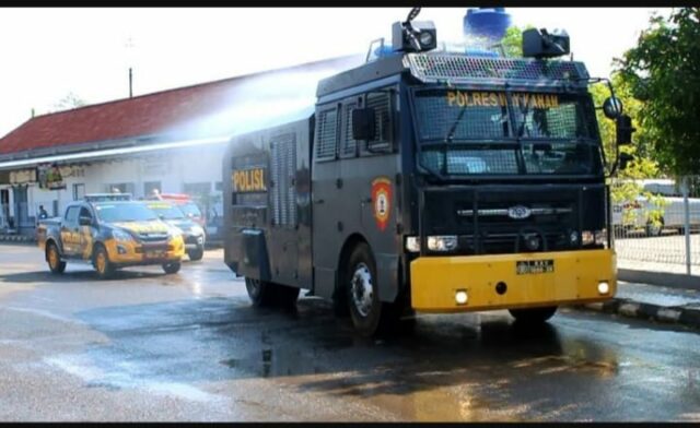 Sementara penyemprotan disinfektan menggunakan kendaraan taktis Polri Armoured Water Cannon ( AWC) milik Polres Way Kanan, yang diiringin Kendaraan Pemadam Kebakaran dan BPBD Kabupaten Way Kanan.