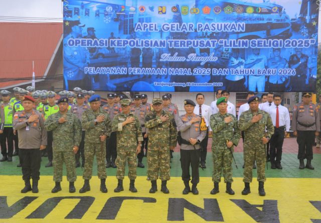 Onlinekoe.com, ( Tanjungpinang ) — Polresta Tanjungpinang menggelar Apel Gelar Pasukan Operasi Kepolisian Terpusat Lilin Seligi 2025 dalam rangka pengamanan dan pelayanan perayaan Natal 2025 serta Tahun Baru 2026. Apel berlangsung di halaman Polresta Tanjungpinang, Jumat (19/12/2025), dan diikuti unsur Forum Koordinasi Pimpinan Daerah (Forkopimda) Kota Tanjungpinang serta instansi terkait.