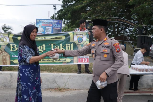 Onlinekoe.com – Dalam menyemarakkan bulan suci Ramadhan 1447 Hijriah (H), Polsek Firdaus dan Polsek Telukmengkudu, Polres Serdangbedagai (Sergai) melaksanakan pembagian takjil berbuka puasa bagi masyarakat yang melintas di depan Mako Polres Sergai Jalinsum Desa Firdaus Kecamatan Seirampah Kabupaten Sergai – Sumut, pada Jumat (13/3/26) sekira pukul 17.00 WIB.