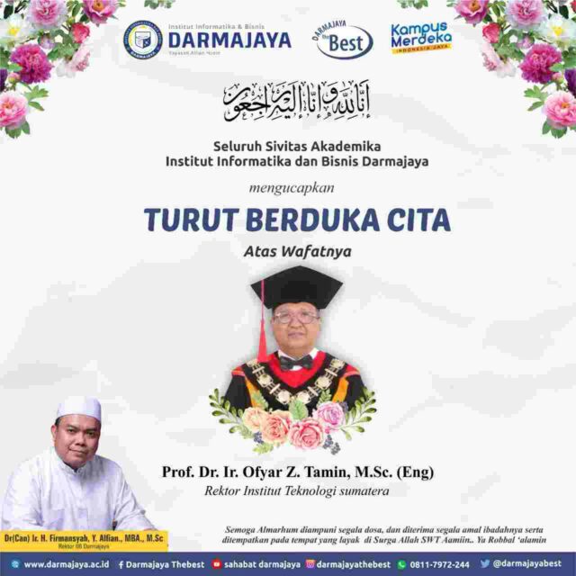 Onlinekoe.com, BANDARLAMPUNG – Pimpinan dan Civitas Academica Institut Informatika dan Bisnis (IIB) Darmajaya turut berduka cita atas berpulangnya Rektor Institut Teknologi Sumatera (Itera) Prof. Ir. Ofyar Z. Tamin, M.Sc., Ph.D., Rabu (9/6/2021), sekira pukul 06.55, di Rumah Sakit Cipto Mangunkusumo (RSCM) Kencana Jakarta Pusat.