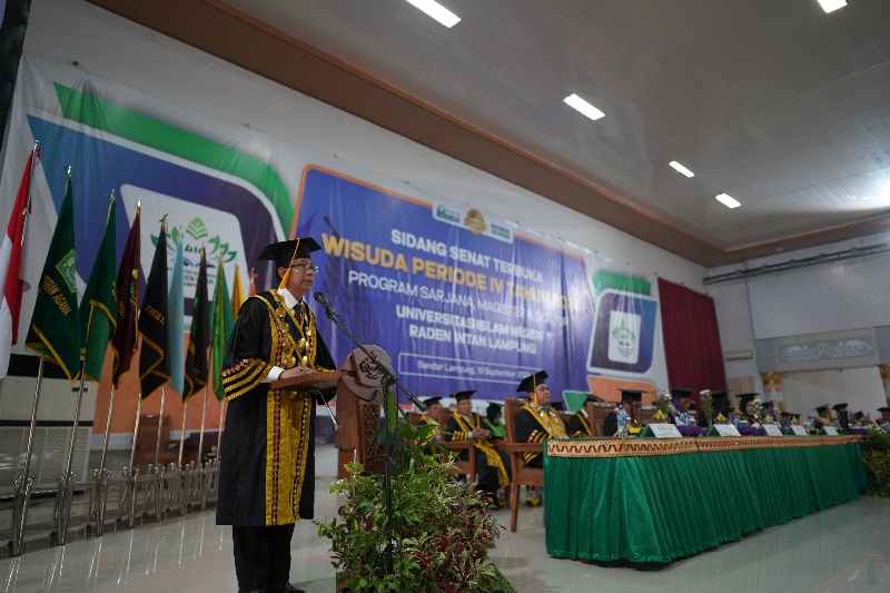 Bandar Lampung – Rektor Universitas Islam Negeri (UIN) Raden Intan Lampung (RIL), Prof H Wan Jamaluddin Z MAg PhD, menyampaikan pesan penting kepada para wisudawan untuk selalu mengamalkan ilmu padi dalam menjalani kehidupan. Pesan tersebut disampaikan pada prosesi sesi kedua Sidang Senat Terbuka Wisuda Periode IV Tahun 2024 yang digelar di Gedung Serba Guna (GSG) KH Ahmad Hanafiah UIN RIL, Kamis (19/09/2024).