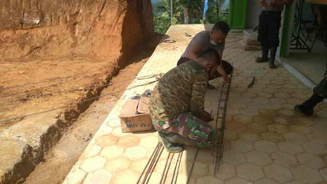 Menurut Sertu Tasripin setelah pengerjaan pondasi dan pemasangan batako sudah tersusun dan terpasang sehingga disiapkan untuk merangkai besi dulu untuk slup atas sebagai pengunci guna pemasangan atap.