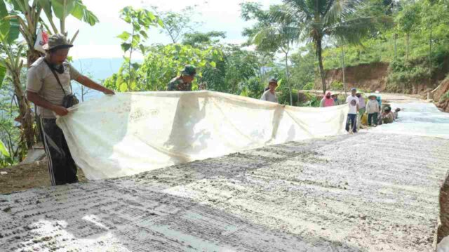 Banjarnegara – Satgas TMMD Reg 111 Ta 2021 Kodim 0704/Banjarnegara bersama warga melaksanakan penutupan rabat beton dengan plastik agar proses pengerasan dapat terbentuk dengan sempurna Desa Kebutuhjurang Kecamatan Pagedongan Kabupaten Banjarnegara. Rabu (30/6/21).