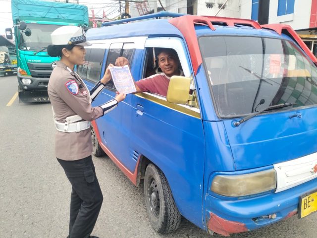 Selain memberikan penyuluhan secara tatap muka, petugas juga membagikan leaflet berisi informasi keselamatan berkendara agar pesan yang disampaikan dapat lebih mudah dipahami dan diingat oleh masyarakat.