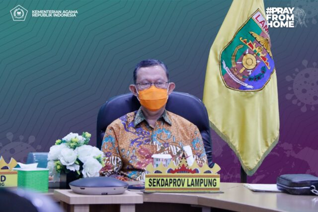 Onlinekoe.com – Gubernur Lampung diwakili Sekretaris Daerah Provinsi Ir. Fahrizal Darminto, MA., bersama Ketua DPRD Lampung, Mingrum Gumay mengikuti kegiatan #PrayFromHome yang diselenggarakan oleh Kementerian Agama RI secara virtual, bertempat di Ruang Command Center Diskominfotik Provinsi Lampung. Minggu, (11/08). Pada kesempatan itu, Sekdaprov didampingi Didampingi Kadis Sosial, Aswarodi dan Kadis Kominfotik, Ganjar Jationo.
