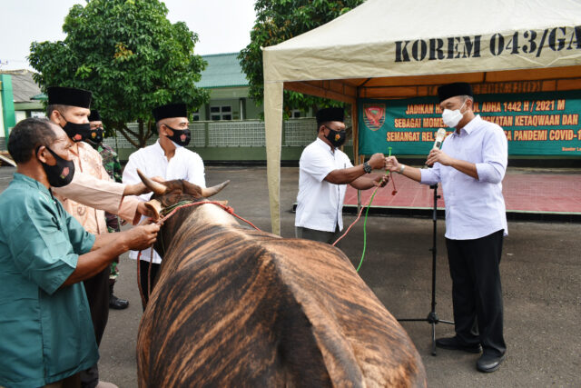“ Kita berharap, dengan kita ikut berkurban di tengah pandemi covid 19 ini, diharapkan kita mampu untuk lebih meningkatkan keimanan, ketaqwaan dan semangat berqurban sebagai wujud ketaqwaan kita kepada Allah SWT,” tegas Danrem 043/Gatam Brigjen TNI Drajad Brima Yoga, S.I.P.,M.H.