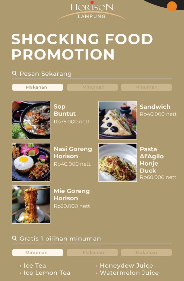 Shocking Food Promotion merupakan promo restaurant denganmengeluarkan 5 varian menu selama PPKM ini ,yaituSoup buntutRp75k, NasiGorengHorison 40k, Mie GorengHorison 30k, Sandwich 40k, Pasta Al AglioHonje Duck 60k. Kelima menu tersebutbisadipesan dine-in Santan Restaurant dari jam 10:00 sd 20:00 WIB, danuntuktamu yang menginap di Hotel Horison Lampung bisamemesan menu tersebutdari jam 10:00 sd 22:00 WIB .