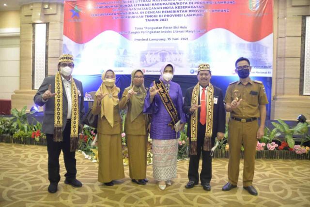 Adapun dalam pengukuhan tersebut, Kepala Perpustakaan Nasional RI, Drs. Muhammad Syarif Bando, MM. mengukuhkan delapan Bunda Literasi Kabupaten/Kota se-Provinsi Lampung, di Swiss-Bel Hotel. Selasa, (15/6/2021).
