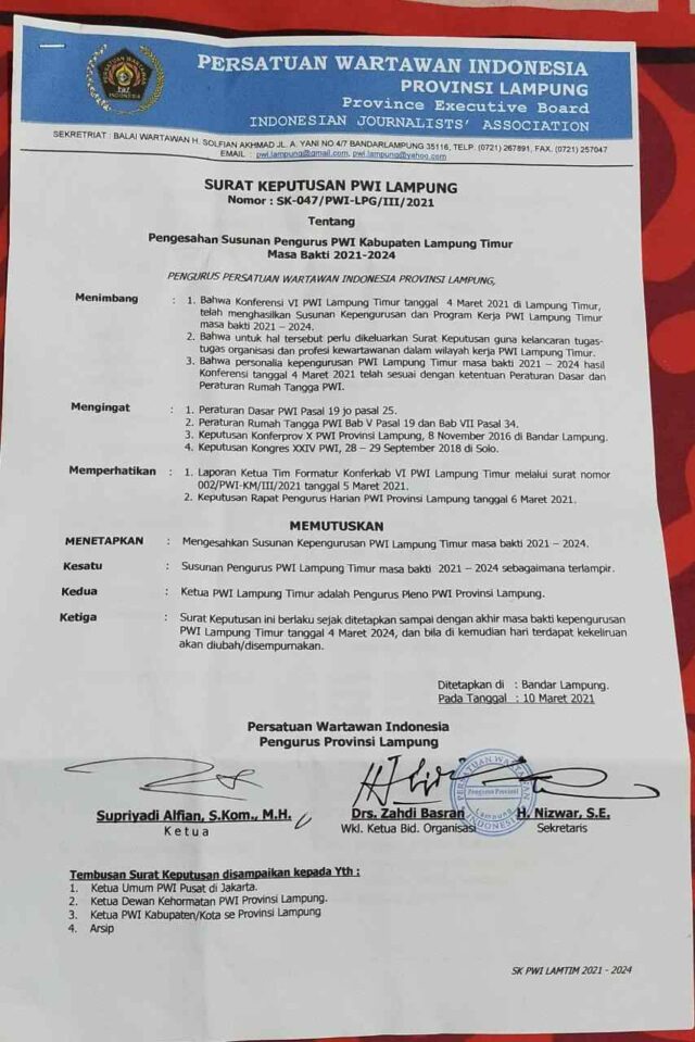Onlinekoe.com, LAMPUNG TIMUR – Surat Keputusan (SK) Kepengurusan Persatuan Wartawan Indonesia (PWI) Kabupaten Lampung Timur (Lamtim) Periode 2021-2024 yang bernomor : SK-047/PWI-LPG/III/2021 telah di terbitkan oleh ketua PWI Provinsi Lampung Supriyadi Alfian, Minggu (21/3).