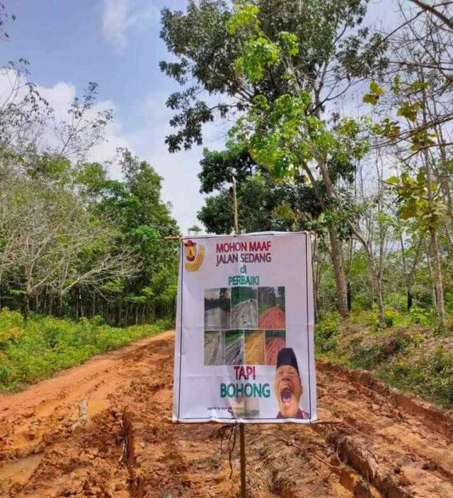 Spanduk yang terpasang dan terbentang di tengah-tengah kerusakan jalan tersebut bertuliskan “Jalan Sedang Diperbaiki, Tapi Bohong” ini Viral disejumlah Media Sosial, kemudian berdasarkan laporan dari Masyarakat sekitar ternyata Spanduk tersebut ungkapan Aspirasi yang hingga kini Akses jalan tersebut belum diperbaiki.