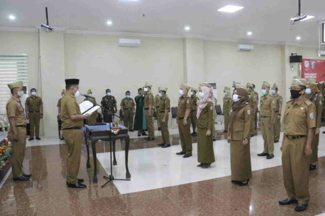 Onlinekoe.com, PRINGSEWU – Aparatur Sipil Negara (ASN) hendaknya dapat menjadi contoh berperilaku bagi masyarakat dalam hal berdisiplin mematuhi protokol kesehatan, serta berharap pandemi segera berlalu dan menjadi sejarah hal ini disampaikan Wakil Bupati Pringsewu Dr.H.Fauzi saat mengukuhkan dan mengamhil sumpah 30 pejabat administrator dan pejabat pengawas di lingkungan Pemerintah Kabupaten Pringsewu