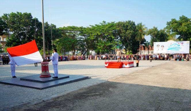 ONLINEKOE.COM LAMSEL – Wakil Bupati (Wabup) Lampung Selatan, M. Syaiful Anwar memimpin upacara Hari Pendidikan Nasional (Hardiknas) Tahun 2025, di Lapangan Korpri, Kalianda, Kompleks Perkantoran Pemkab setempat. Jumat, 2 Mei 2025.