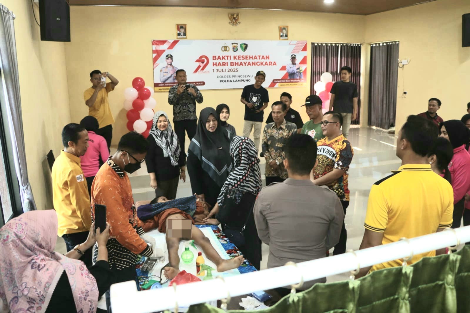 Pringsewu – Menyambut Hari Bhayangkara ke-79, Kepolisian Resor Pringsewu bekerjasama sama dengan Dinas Kesehatan Pemerintah Kabupaten Pringsewu mengadakan Bakti Kesehatan. Kegiatan berupa khitanan massal yang diikuti belasan anak-anak ini dilaksanakan di Aula Mapolres Pringsewu, Kamis (26/6/2025).