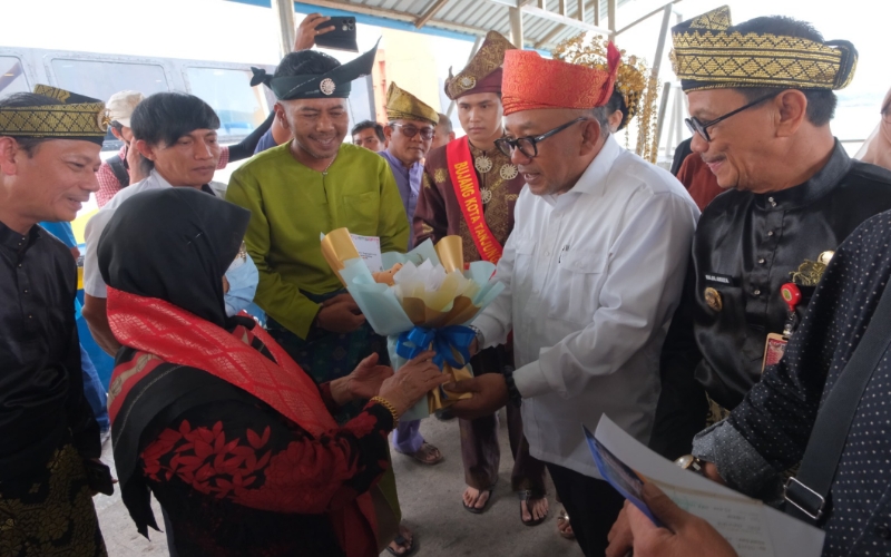 Wali Kota Tanjungpinang, H Lis Darmansyah, S.H saat menyambut dua wisatawan pertama asal Singapura di Pelabuhan Internasional Sri Bintan Pura, Kamis (1/1/2026). CV Kedua pengunjung tiba menggunakan ferry Sindo Fest Merbau Era dan disambut Wakil Wali Kota Drs. H Raja Ariza, M.M serta unsur Forkopimda.