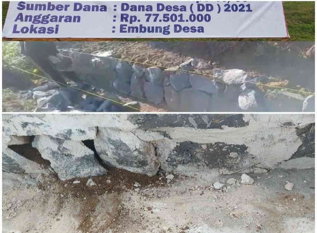 Kepada wartawan, Mbah Warno (64th) mengatakan, dugaan asal jadi dalam proyek ini, terlihat dari cara penyusunan batu dan semen yang dicampur tanah.