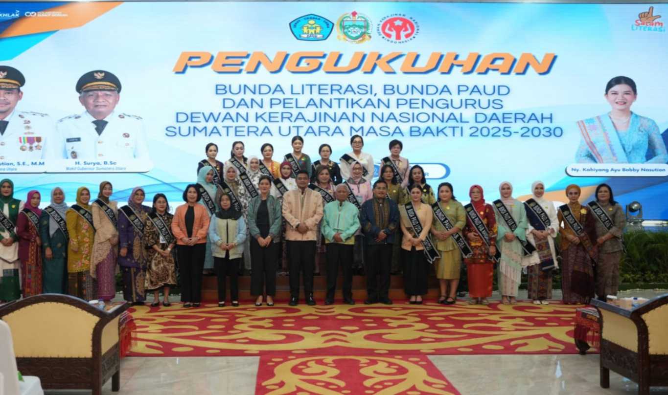 Onlinekoe.com|Asahan Sumut -.Medan, 13 Agustus 2025 – Pemerintah Provinsi Sumatera Utara menggelar prosesi pengukuhan Bunda Literasi dan Bunda PAUD dari 33 kabupaten/kota se-Provinsi Sumatera Utara di Aula Raja Inal Siregar, Kantor Gubernur Sumatera Utara, Jalan Diponegoro, Medan.